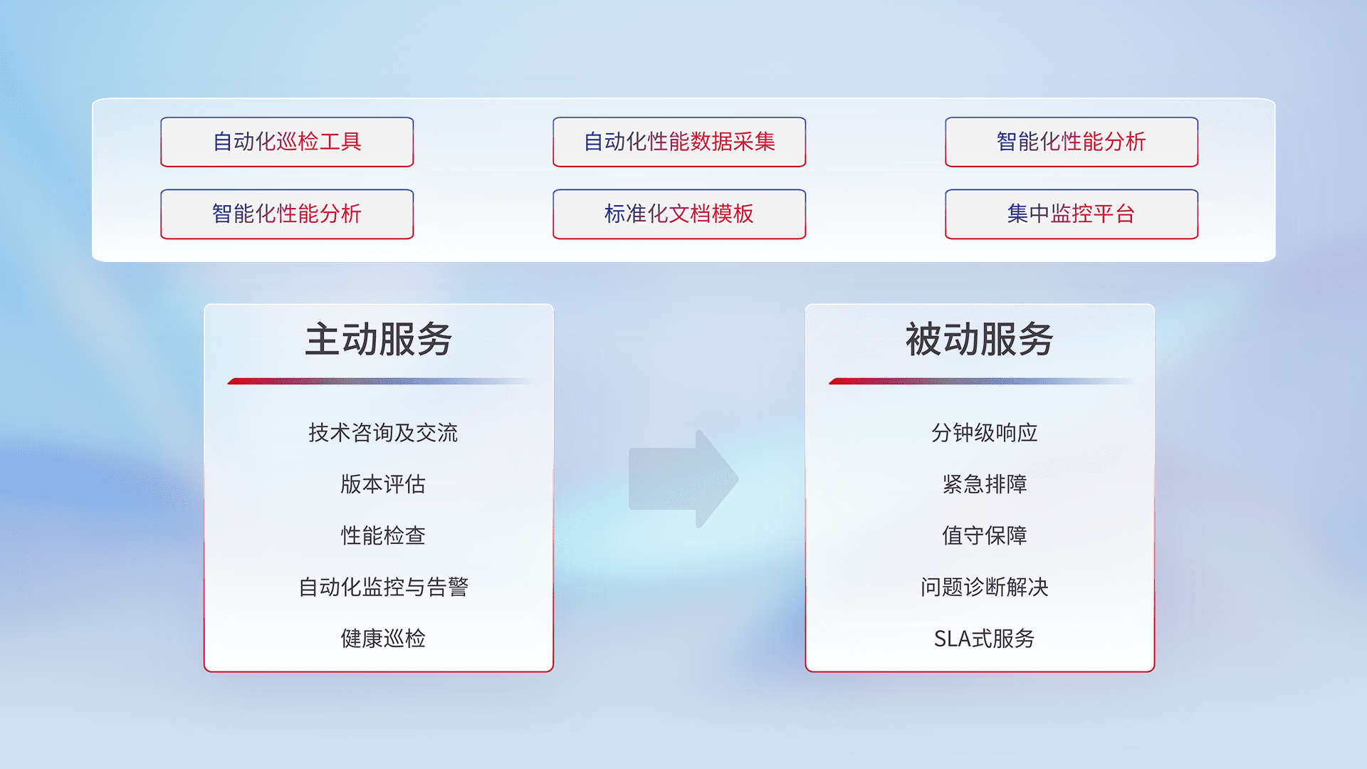 智能化工具和标准化文档,,,保障服务质量,,,提供主动服务(包含技术咨询、、、、版本评估、、、、性能检查、、、、自动化监控与告警、、、健康巡检)和被动服务包含(分钟级响应、、、紧急排障、、、、值守保障、、、、问题诊断解决、、、、SLA服务)。。