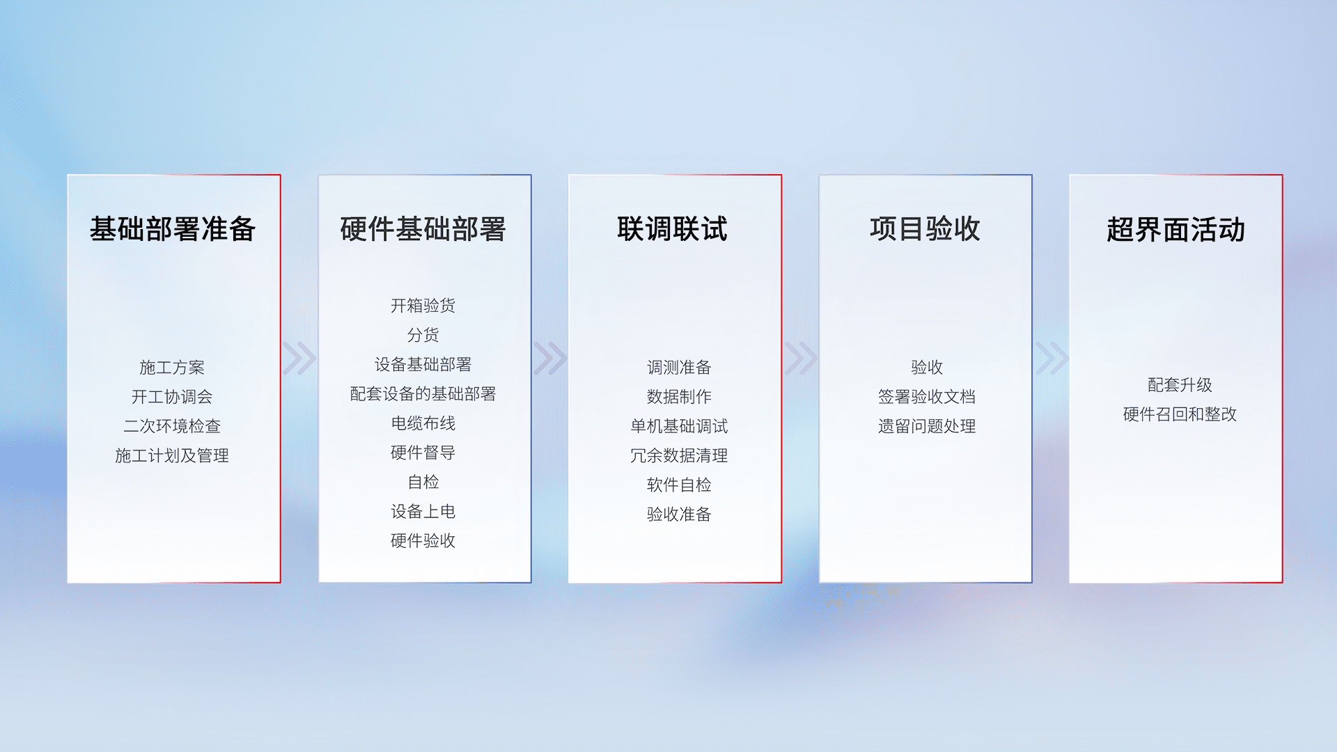 从基础部署准备、、、、硬件基础部署、、联调联试、、项目验收、、越界面活动的全过程可追溯,,,保证施工质量和进度。。